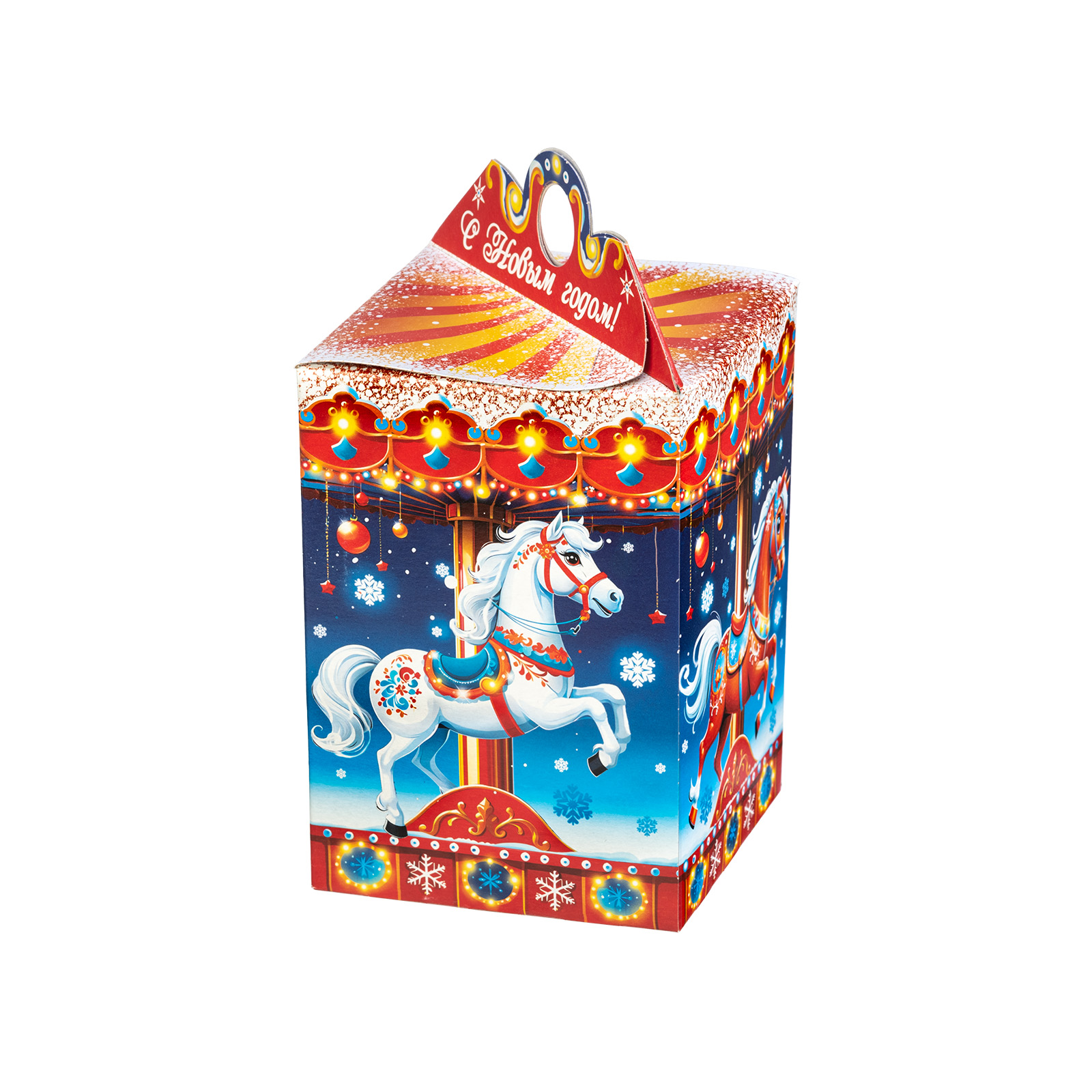 Прекрасный новогодний сладкий подарок, который поднимет настроение сластене абсолютно любого возраста. Это небольшая картонная коробочка в форме фонарика, украшенная одной большой яркой композицией. С каждой стороны нарисованы грациозные лошадки, прям как на той самой карусели из парка аттракционов! Сверху и снизу упаковки тянутся контрастные линии, украшенные новогодними символами, а на крышке есть небольшая удобная ручка и поздравительная надпись. Такой подарок будет к месту как на детском празднике, так и на корпоративе - каждый найдет в этом наборе для себя что-то приятное и теплое.